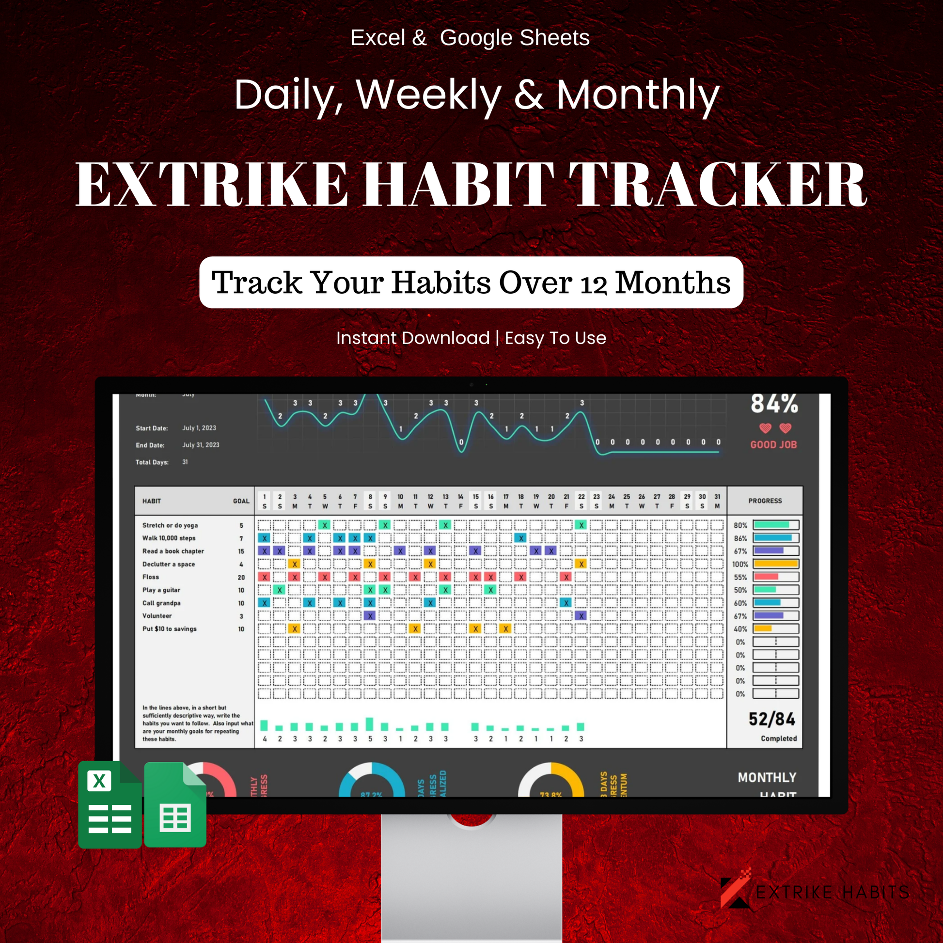 Extrike Ultimate Habit Tracker Bundle | Daily, Weekly & Monthly Excel Spreadsheet